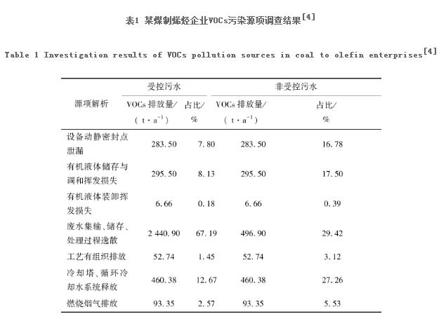 目前,我國只有少數現代煤化工企業開展了VOCs核查。表1為某煤制烯烴企業VOCs的源項核查結果(將氣化灰水及污水汽提塔底凈化水分為受控污水和非受控污水2種情況)[4]。