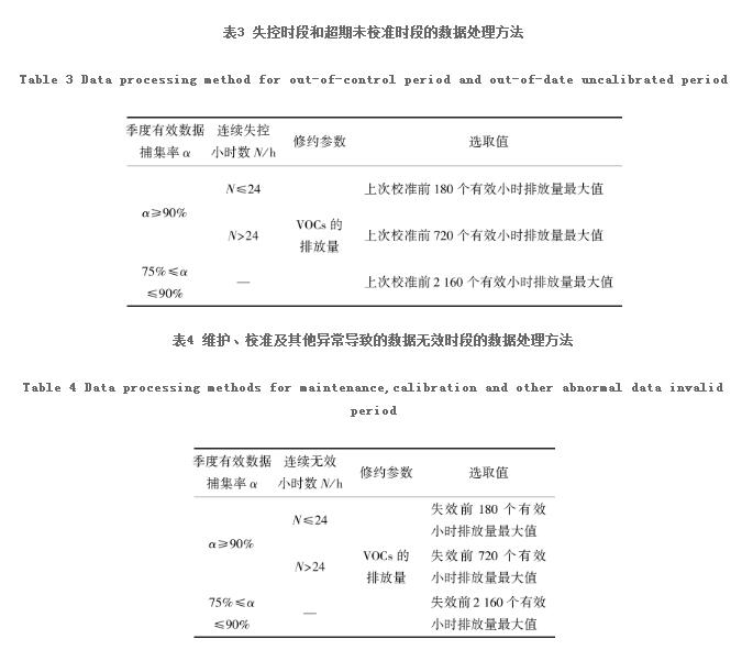 數據審核方面,可參照HJ 75提出有效數據捕集率全年必須達75%。失控時段的數據可按照表3中的方法對VOCs排放量進行修約,非甲烷總烴濃度和廢氣參數不修約。故障期間、維修期間的數據,可使用參比方法監測的數據替代,也可按照表4中的方法對VOCs排放量進行修約,非甲烷總烴濃度和廢氣參數不修約。當采用參比方法監測的數據替代時,頻次不低于每天1次,參比方法的監測過程按照GB/T 16157、HJ/T 397、HJ 732、HJ 38要求進行,替代數據包括非甲烷總烴濃度、廢氣參數和VOCs排放量。維護保養和校準及其他異常導致的數據無效時段,VOCs排放量按照表4處理,非甲烷總烴濃度和廢氣參數不修約。