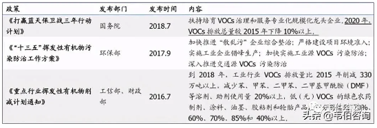 2017年9月,原環保部、發改委等6部委發布《“十三五”揮發性有機物污染防治工作方案》要求:到2020年,建立健全以改善環境空氣質量為核心的VOCs污染防治管理體系,重點推進石化、化工、包裝印刷、工業涂裝等重點行業以及機動車、油品儲運銷等交通源VOCs污染防治,并明確至2020年,重點地區、重點行業VOCs污染排放總量下降10%以上。